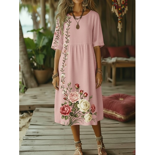 Per donna Abito Midi Finto cotone e lino Abito Boho Abito a Tubino Vestito Casual Vintage Quotidiano All'aperto Spiaggia Vestibilità comoda Floreale Mezza Manica Girocollo Blu Rosa Arancione Verde