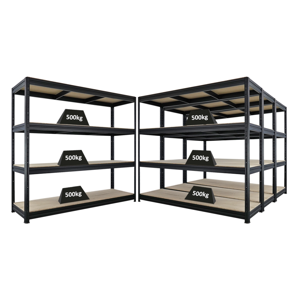 Proregal Mega Deal | 4x Schwerlastregal DINO | HxBxT 180x200x60cm | 4 Spanplatten-Ebenen 16mm | Fachlast 500kg | Schwarz