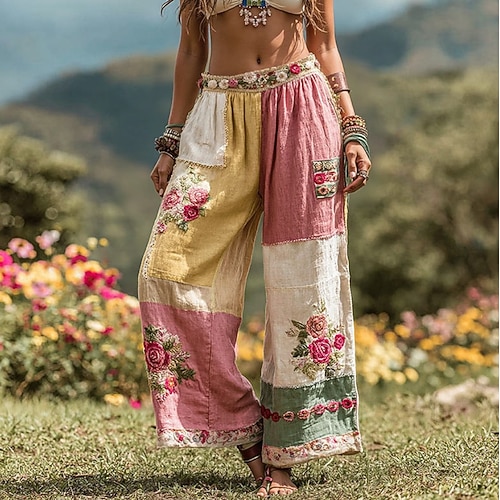 Per donna Gamba larga Vacanza Vintage Stile Etnico Lunghezza intera Vita Alta Floreale Grafico Inelastico Formale Vacanza Streetwear Marrone scuro Bianco latte Bianco Estate Primavera Vestibilit