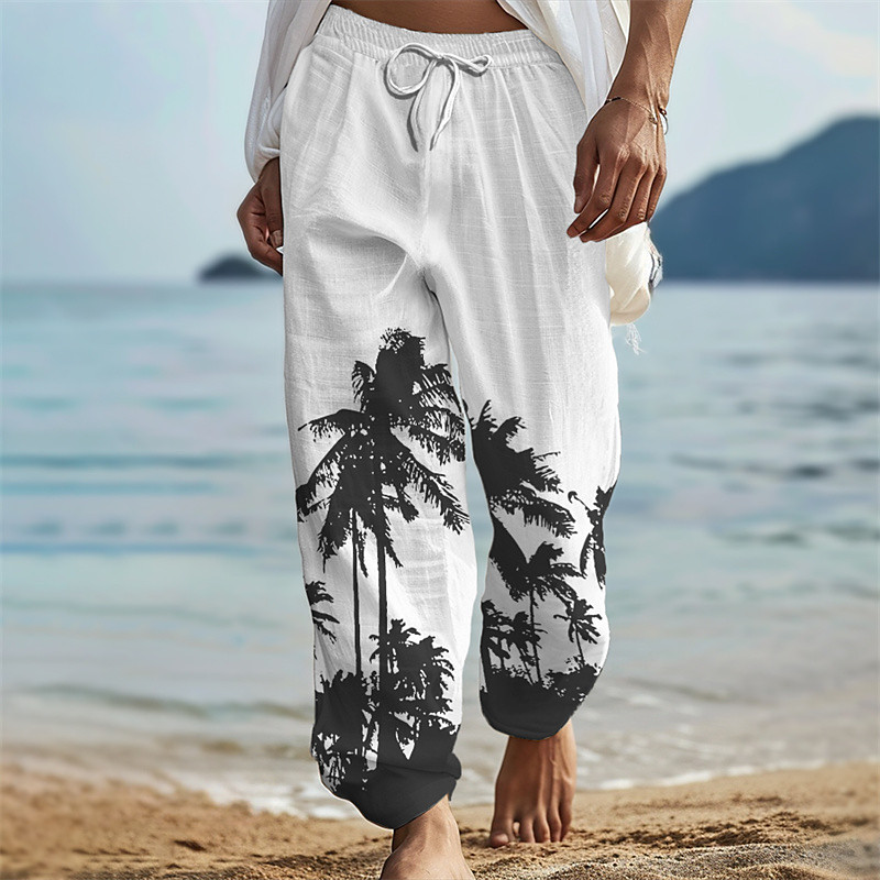 Men's Coconut Tree Linen Pants Pants Trousers Baggy Pants Mid Waist Vintage Outdoor Daily Wear Beach Fall Winter White Blue Green