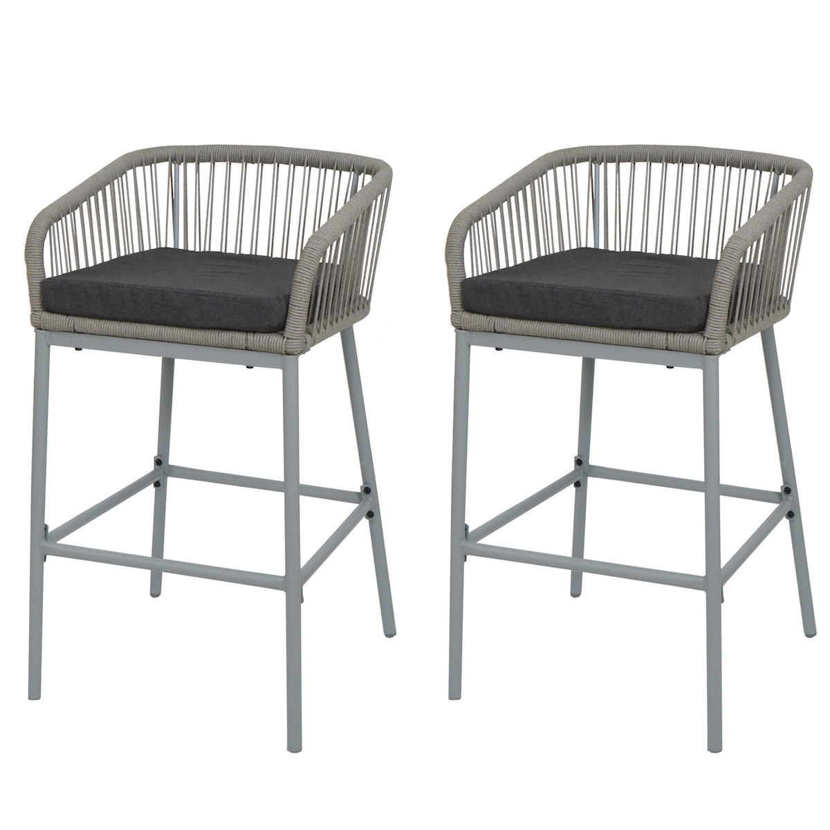 PROREGAL 2er-Set Rope-Barhocker | HxBxT 92x51x53 cm | Sitzhöhe 76cm | Outdoor Sitzpolster Seilgeflecht Metall | Hellgrau | Kissen Dunkelgrau