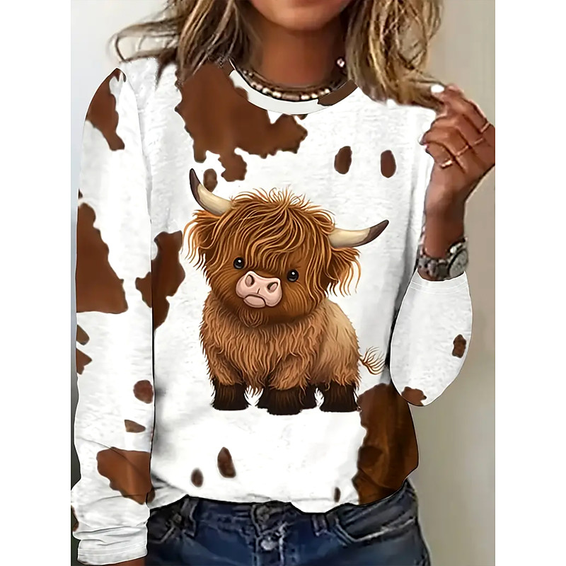Women's T shirt Long Sleeve Graphic Animal Cow Vintage Stylish Casual Long Sleeve Crew Neck Regular Tops Daily Print Light Brown Spring Fall Prefall