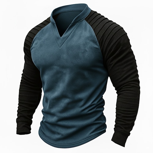 T-shirt da uomo in finta pelle scamosciata, manica lunga, scollo a V, design antirughe, plissettata, autunno inverno, color block, vintage, quotidiano, retrò, arricciato, color block, per esterni, strada, casual, blu, marrone, kaki