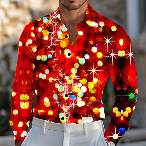 Weihnachten Herren Funkelnder Glitzer Weihnachtslicht Hemd Satinhemd Kleidhemd Langarm Modisch lässig Outdoor Party Ferien Frühling Herbst Umlegekragen 3D-Druck Hemden mit Knopfleiste Rote Blau