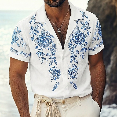 Herren Blumendruck Blumen Hemd Knopfhemd Camp-Kragenhemd Kurze Ärmel Vintage-Retro Alltagstauglich Strandurlaub Sommer Frühling Kubanisches Halsband 3D-Druck Leinenähnliches Hemd Blau Rote Purpur Grün
