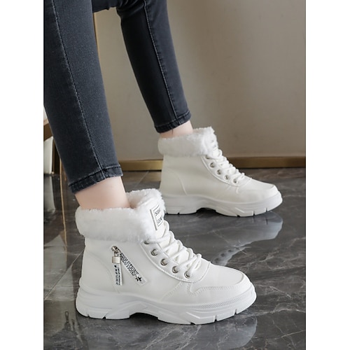 sneakers alte bianche calde da donna con fodera in pelliccia sintetica - scarpe invernali alla moda con suola spessa per un abbigliamento casual all'aperto