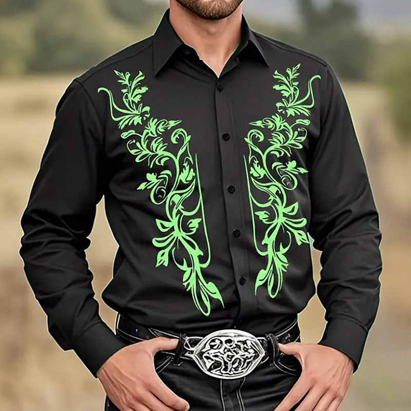 Men's Floral Print Ethnic Flowers Shirt Western Shirt Cowboy Shirt Long Sleeve Vintage Retro Outdoor Vacation Spring Fall Turndown 3D Print Linen Like Shirt Black Grey Black Green Black BlackBlue