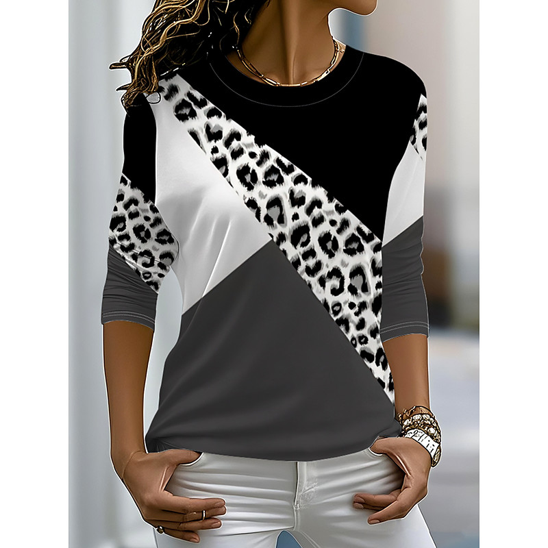 Women's T Shirt Graphic Leopard Geometric Vintage Fashion Stylish Long Sleeve Crew Neck Round Neck Regular Tops Daily Weekend Print Black and gray Fall Winter