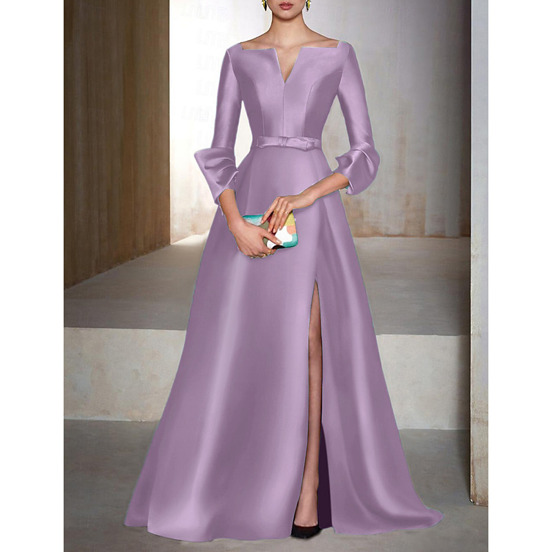 A-Line Floor Length Evening Gown Ball Gown Formal Dress Elegant Silky 3/4 Length Sleeve V Neck Wedding Guest Cocktail Party Satin with Slit