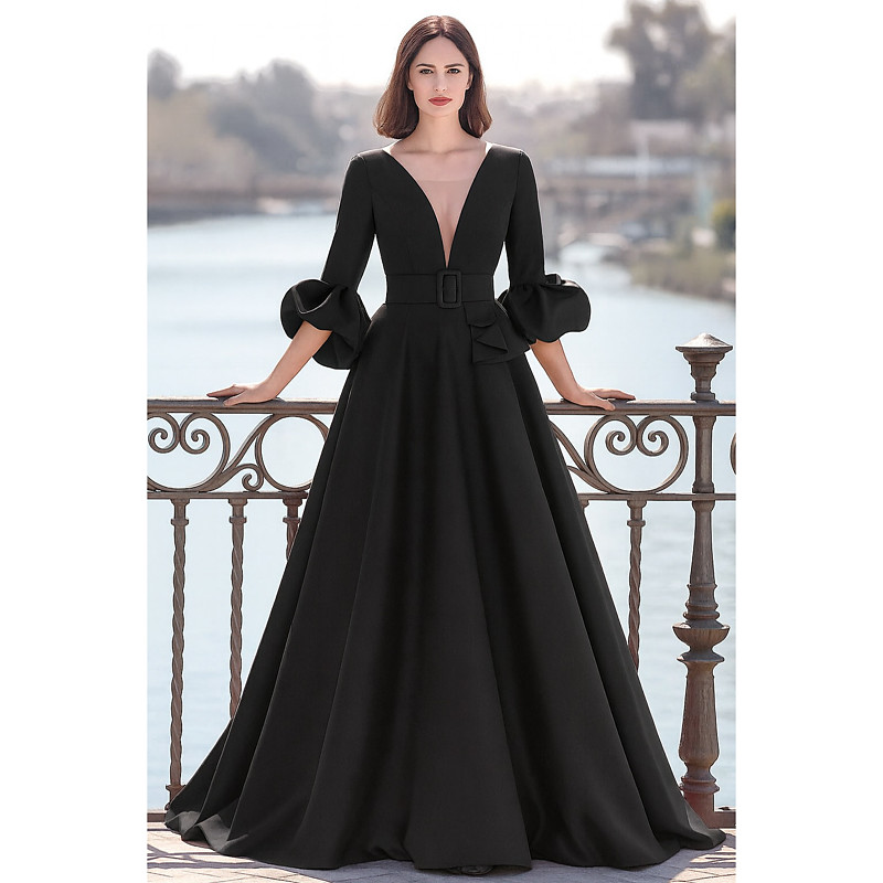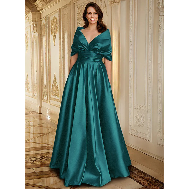 A-Line Floor Length Evening Gown Ball Gown Formal Dress Elegant Vintage Silky 3/4 Length Sleeve V Neck Wedding Formal Pocket Stretch Satin with Ruffles