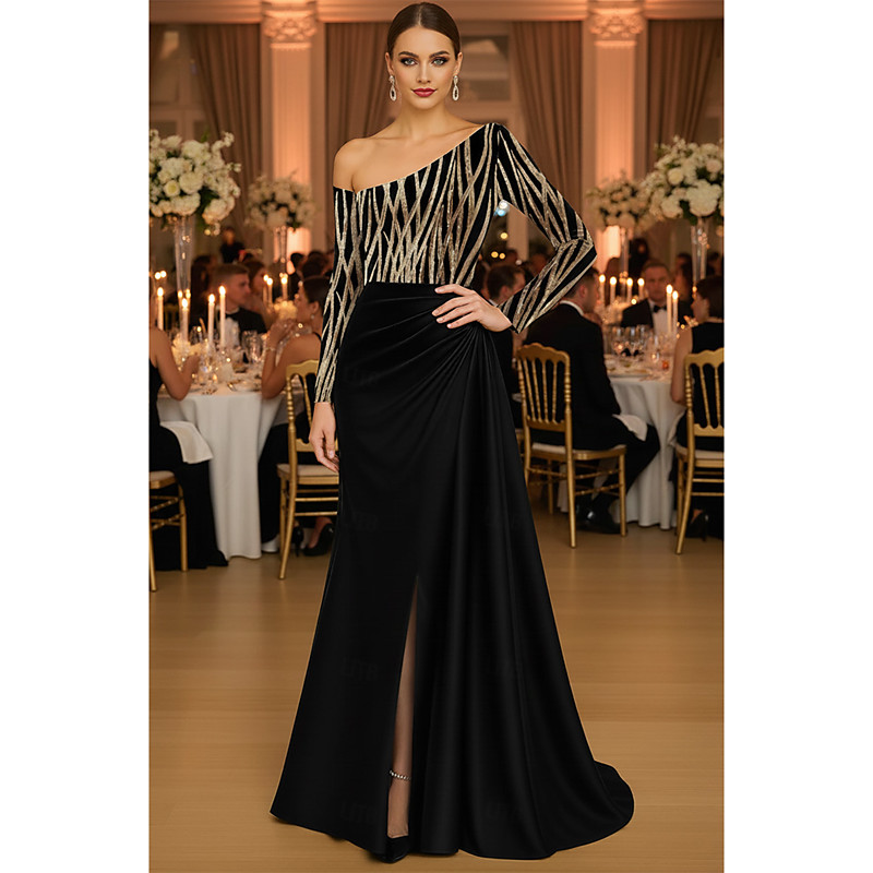 A-Line Sheath Column Sweep Brush Train Prom Dresses Evening Gown Ball Gown Formal Dress Elegant Glittering Celebrity Style Long Sleeve One Shoulder Garden Party Wedding Satin Stretch Satin with Ruched
