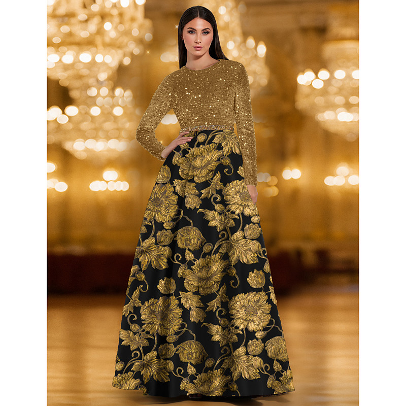 A-Line Floor Length Evening Gown Ball Gown Formal Dress Elegant Long Sleeve Crew Neck Wedding Formal Pocket Sequined Velvet with Crystals Beading