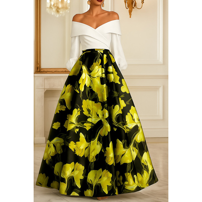A-Line Floor Length Ball Gown with Cape Evening Gown Formal Dress Elegant Vintage Floral Long Sleeve Off Shoulder Wedding Formal Capes Satin Jacquard with Floral Print Pocket