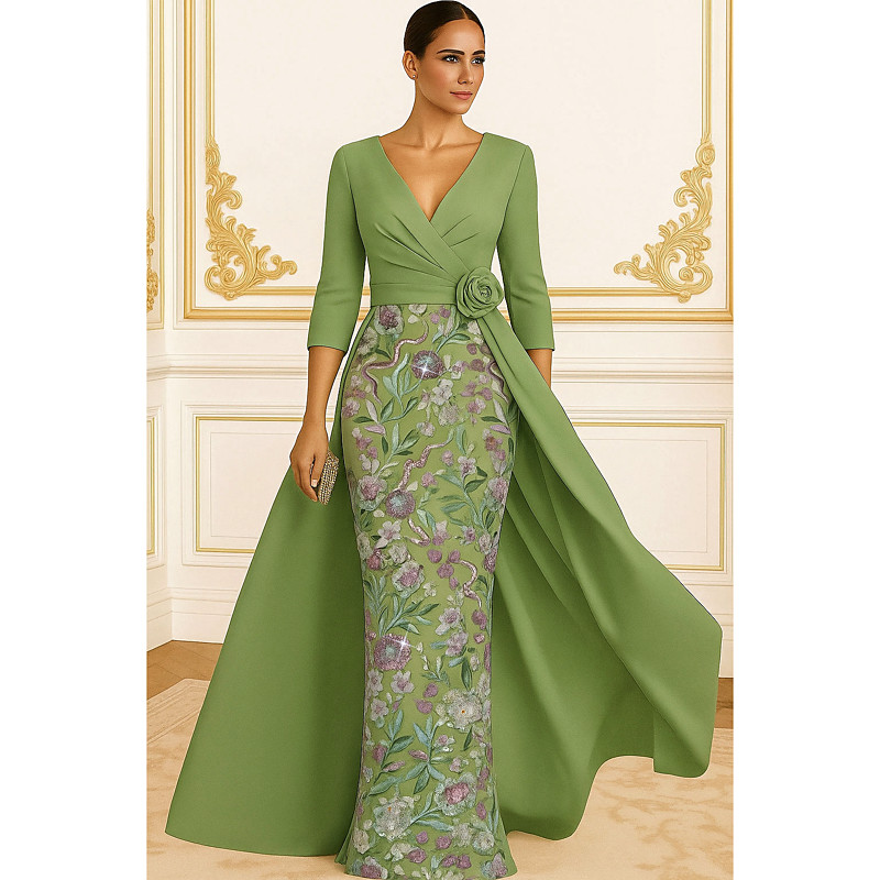 A-Line Sheath Column Floor Length Beaded Eembroidered Formal Dresses Mother of the Bride Dress Evening Gown Ball Gown with Overskirt Formal Dress Elegant Glittering Silky 3/4 Length Sleeve V Neck