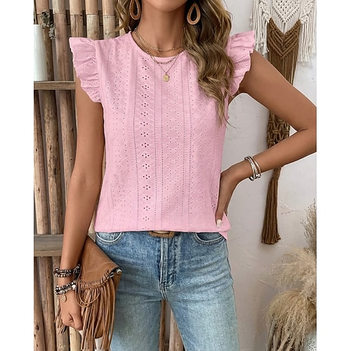 Per donna T-shirt con ricamo a occhielli Volant Taglio Asta Tinta unica Elegante Vintage Casual Manica Corta Ad aletta Girocollo Top Regolari Casuale Quotidiano Uscire Bianco Rosa Vino Azzurro Estate