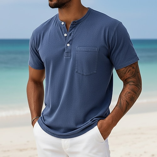 Per uomo Maglia Henley Manica Corta Henley Estate Primavera Autunno Retrò Vintage Casual Stile Vintage Lavato Casuale Blu chiaro Nero Rosa Maglietta Top per Uomo