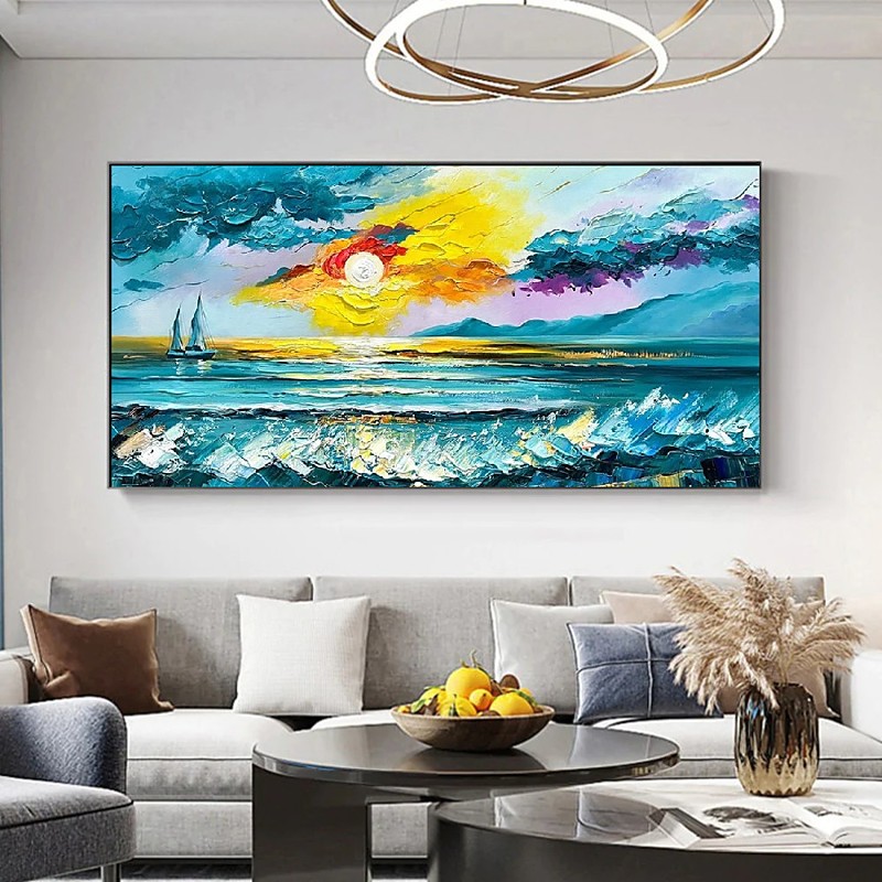 Handmade 3D Coastal Landscape Oil Painting Coastal Landscape Sailboat Scene with Vibrant Color Palette and Impasto Brushstrokes Unique Piece for Home Decor Modern Rolled Canvas