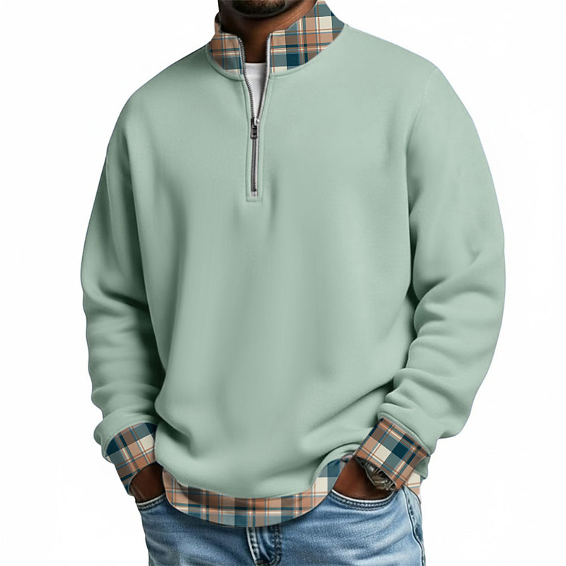 Men's Plaid Patchwork Zip Polo Shirts Long Sleeve Polo Shirts Grandad Collar Casual School Athleisure Holiday Daily Wear 3D Print Quarter Zip Polo Spring Fall Winter Blue Navy Blue Brown