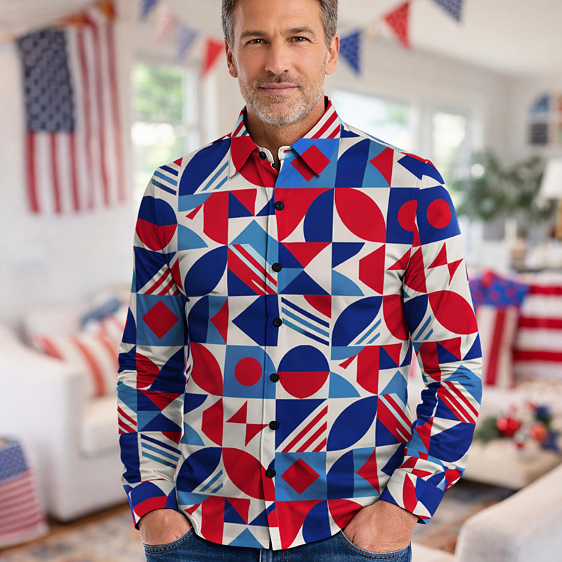 American 250 Retro Vintage 1970s Shirt Aloha Shirt Long Sleeves Hippie Geometic Ethnic Fancy Dress Men's Masquerade 4th of July Party Independence Day Semiquincentennial Adults' Shirt