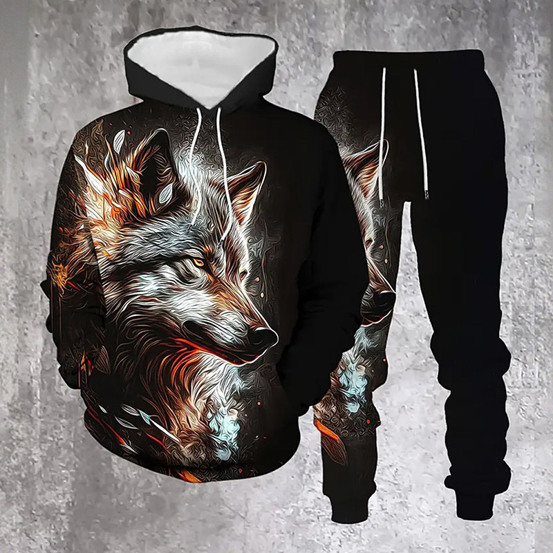 Men's Animal Wolf 2pcs 3D Sweatshirt Sets Tracksuit Hoodie Sweatshirt Long Sleeve Long pants Hooded Casual Daily Athleisure Daily Wear 3D Print Spring Fall Winter Orange Green
