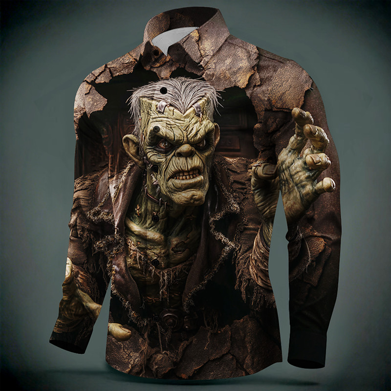 Halloween Men's Zombies Horror Distressed Print Shirt Button Up Shirt Long Sleeve Dark Punk Gothic Style Outdoor Holiday Summer Spring Turndown 3D Print Collared Shirts Dark Green Brown