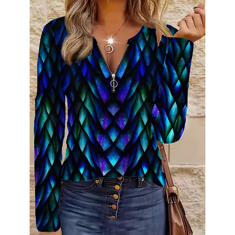 Women's T Shirt Graphic Geometric Abstract Vintage Fashion Stylish Long Sleeve Crew Neck Regular Tops Daily Zipper Print Blue Green Spring Fall