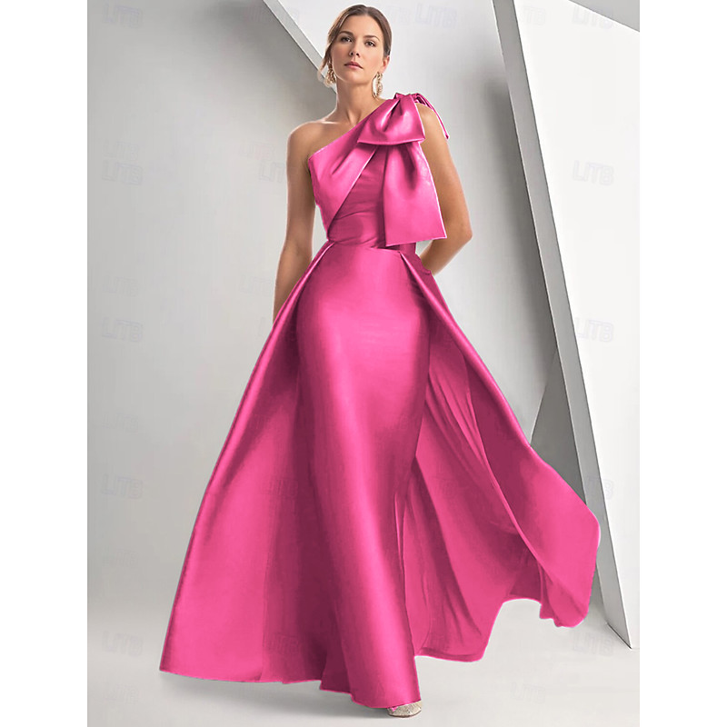 A-Line Floor Length Evening Gown Ball Gown with Overskirt Formal Dress Elegant Sleeveless One Shoulder Christmas Formal Fall Wedding Guest Satin with Bow(s)
