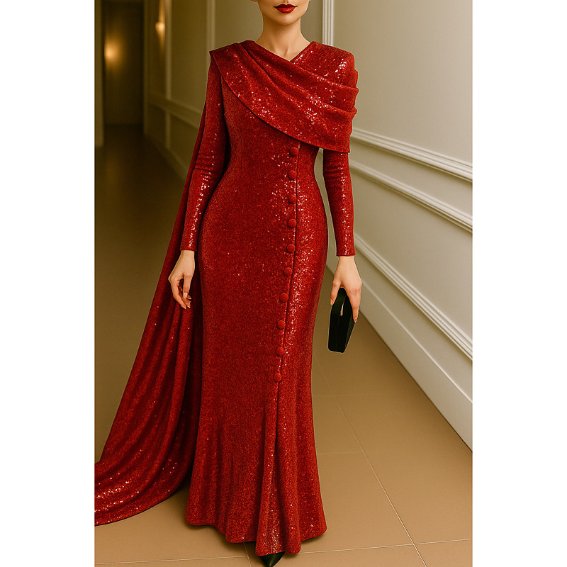 Sheath Column Floor Length Ball Gown with Cape Evening Gown Formal Dress Elegant Glittering Long Sleeve High Neck Wedding Formal Capes Sequined with Glitter