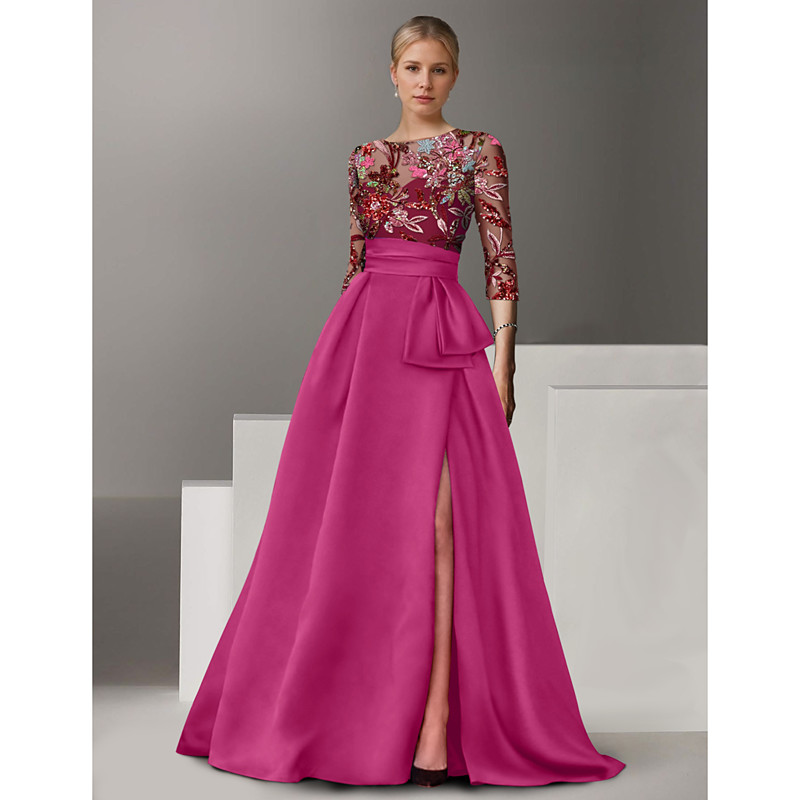 A-Line Floor Length Beaded Eembroidered Formal Dresses Mother of the Bride Dress Evening Gown Ball Gown Formal Dress Elegant Color Block High Split Half Sleeve Shirt Collar Wedding Formal Satin with