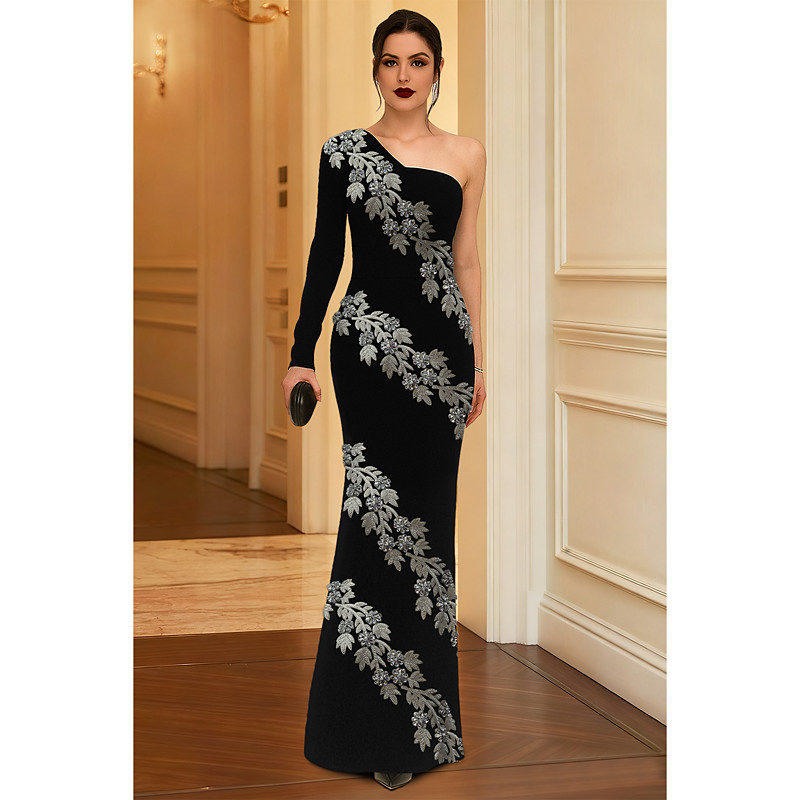 Mermaid Trumpet Floor Length Beaded Eembroidered Formal Dresses Mother of the Bride Dress Prom Dresses Evening Gown Ball Gown Formal Dress Elegant Glittering Celebrity Style Long Sleeve One Shoulder