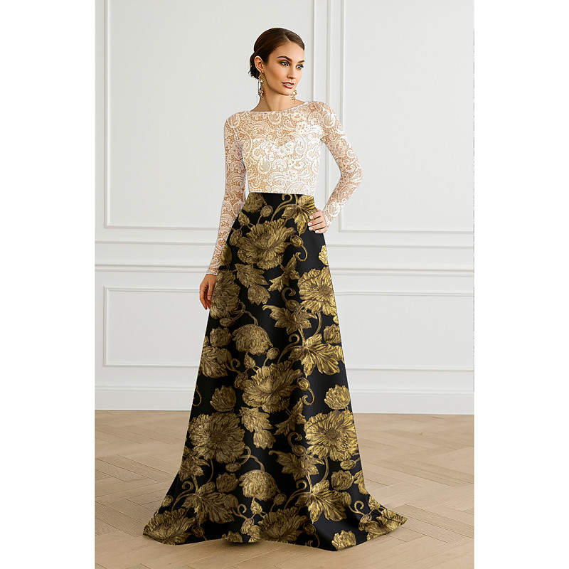 A-Line Floor Length Prom Dresses Evening Gown Ball Gown Formal Dress Elegant Glittering Celebrity Style Long Sleeve Boat Neck Garden Party Wedding Lace with Print