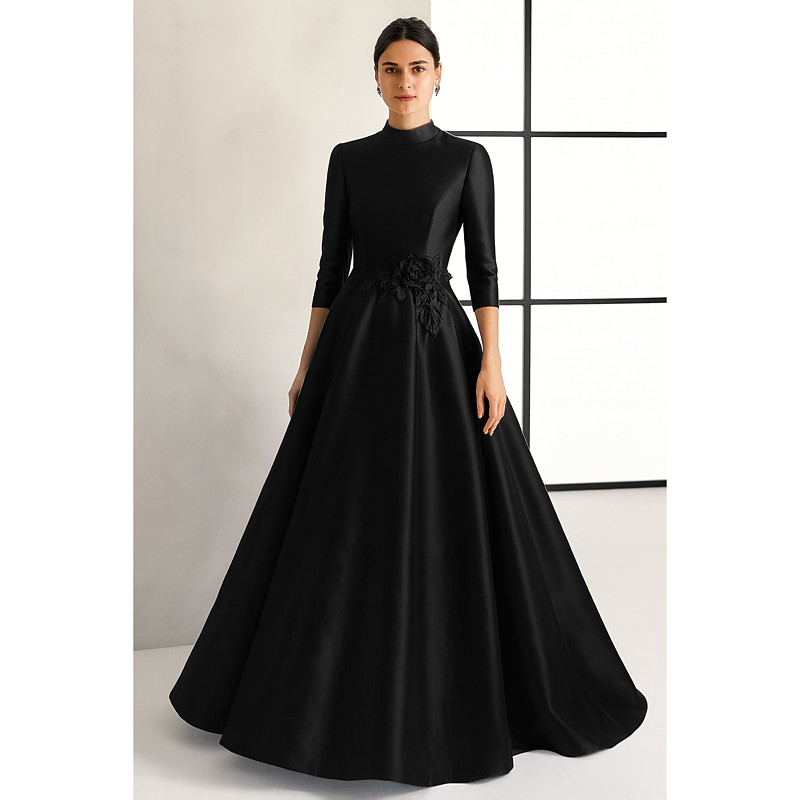 A-Line Floor Length Evening Gown Ball Gown Formal Dress Elegant Glittering Silky Long Sleeve High Neck Wedding Formal Pocket Satin with Pleats Pocket