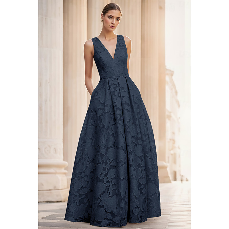 A-Line Floor Length Evening Gown Ball Gown Formal Dress Elegant High Split Sleeveless V Neck Wedding Formal Pocket Jacquard with Pocket