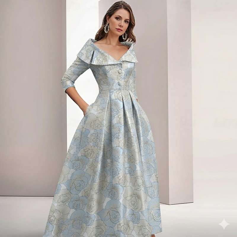 A-Line Floor Length Formal Dresses Floral Dress Evening Gown Ball Gown Formal Dress Elegant Floral High Split Long Sleeve Shirt Collar Wedding Formal Pocket Jacquard with Pocket