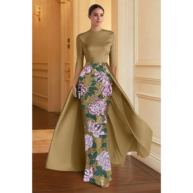 A-Line Floor Length Beaded Eembroidered Formal Dresses Mother of the Bride Dress Evening Gown Ball Gown with Overskirt Formal Dress Elegant Glittering Sparkle Half Sleeve Crew Neck Wedding Formal