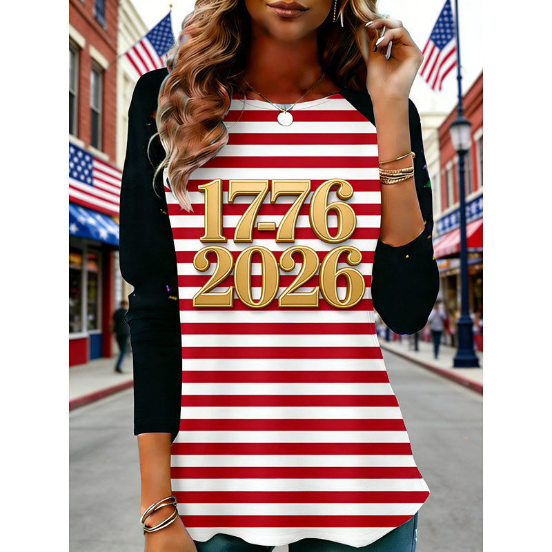 American Independence Day Women's T Shirt Tee Top Graphic Striped Fashion Stylish Classic Long Sleeve Crew Neck Regular Tops Daily Weekend Vacation Wear Print Red Spring Fall