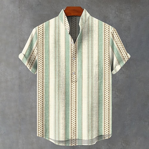 Per uomo Camicia di lino Camicia popover Maglia Henley Camicie retrò Camicia vintage Camicia etnica A righe Vacanza Casuale Verde Manica Corta Collo alla coreana Estate Primavera Abbigliamento