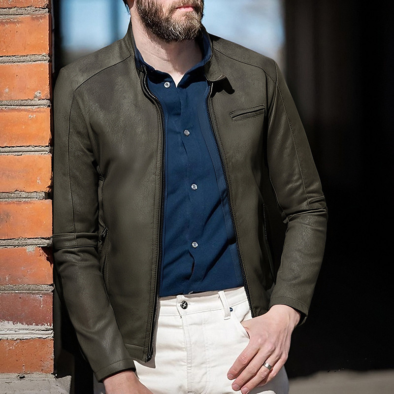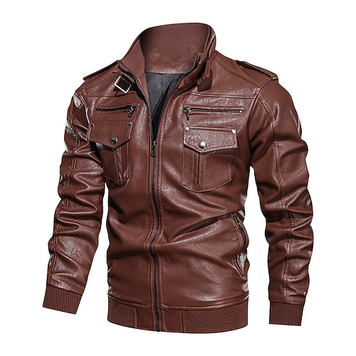 Men's Faux Leather Jacket Biker Jacket Motorcycle Jacket Vacation Daily Windproof Warm Pocket Fall Winter Plain Fashion Classic Stand Collar Regular Black Brown Green Jacket