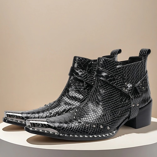 Schwarze Harley-Motorradstiefel für Herren mit Schlangenhautmuster, spitzer Zehenpartie, Zehenkappe aus Metall, Knöchelschnallenriemen, kurze Stiefel im Western-Rock-Stil für Biker, Konzerte, Partys und Abende