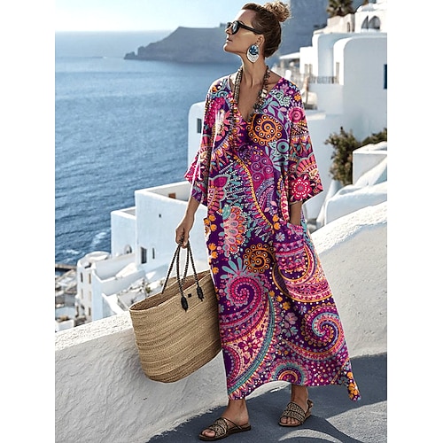 Per donna Abito maxi Vestito Estivo Abito a trapezio Vacanza Casual Boho Spiaggia Uscire Vestibilità comoda Floreale Grafico Geometrico Manica Lunga Scollo a V Fucsia Estate Primavera
