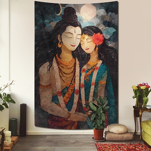 Arazzo da parete con l'immagine di Shiva e Parvati, amore divino, raffigurante il dio indù Shiva e la dea Parvati, con luna piena e cielo stellato, ideale per studio di yoga, sala meditazione, camera
