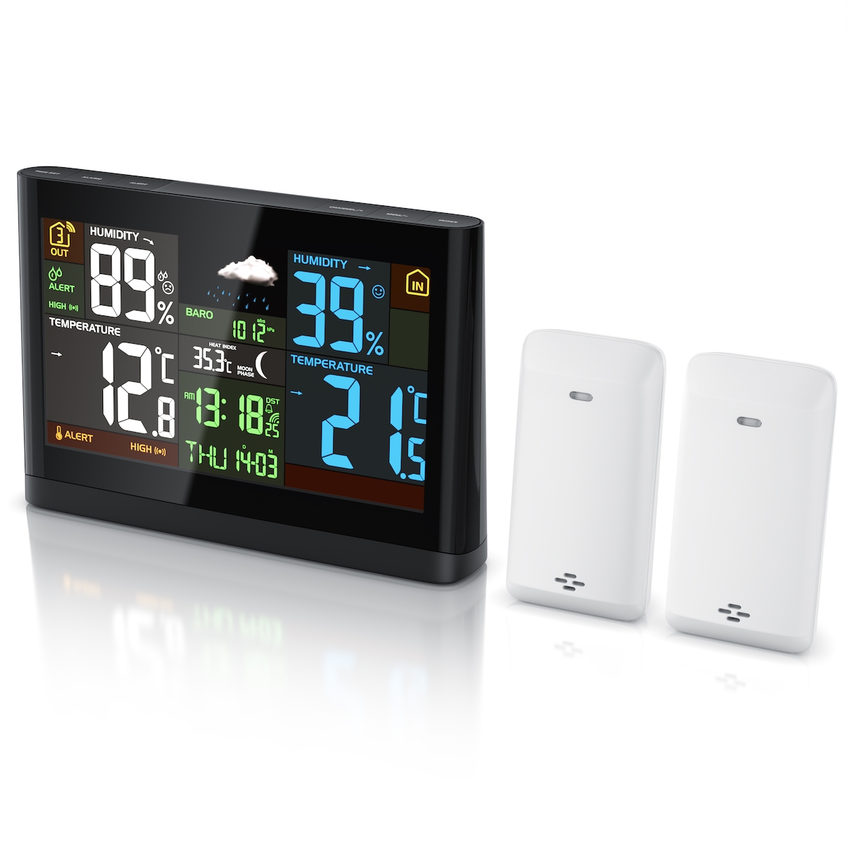 BEARWARE - Wetterstation Funk mit Farbdisplay und Außensensor - DCF Signal - DST - Innen und Außentemperatur - Temperaturwarnung Alarm Frostalarm