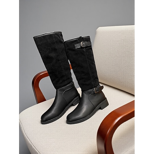 stivali alti fino al ginocchio da donna con cinturini con fibbia e design ampio, con tacco medio e stile versatile per abbigliamento casual e da sera
