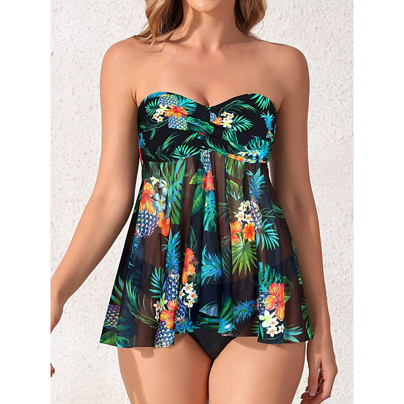 Women's Tankini 2 Piece Swimsuit Shorts Tummy Control High Waist Slim Backless Vacation Beach Wear Floral U Neck Sleeveless Bathing Suits