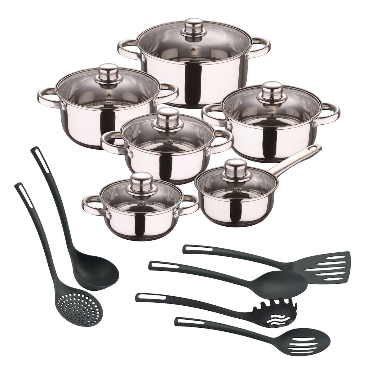 WellHome - 12-teiliges Kochgeschirrset aus Edelstahl mit 6 einfachen schwarzen PBT-Küchenutensilien