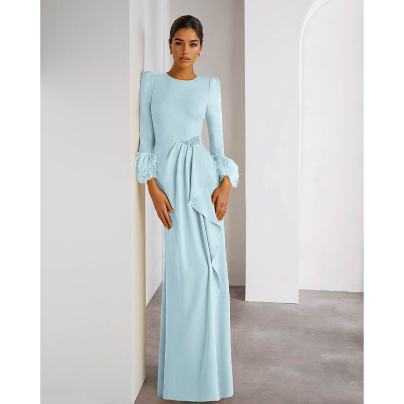 Sheath Column Floor Length Prom Dresses Evening Gown Ball Gown Formal Dress Elegant Vintage Long Sleeve Crew Neck Wedding Formal Detachable Stretch Crepe with Feather