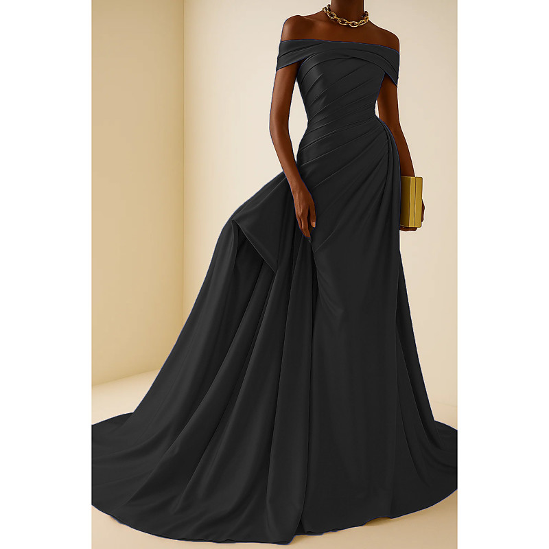 A-Line Mermaid Trumpet Court Train Floor Length Prom Dresses Evening Gown Ball Gown Formal Dress Elegant Glittering Celebrity Style Sleeveless Off Shoulder Garden Party Wedding Satin with Pleats