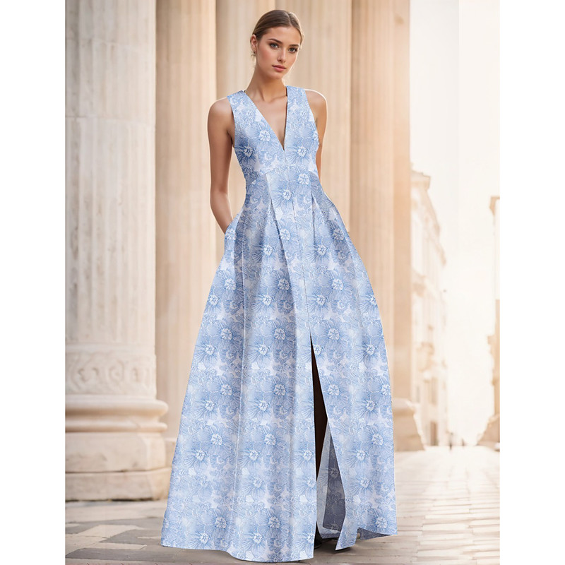 A-Line Floor Length Evening Gown Ball Gown Formal Dress Elegant Vintage Sleeveless V Neck Wedding Formal Nylon with Slit Pocket