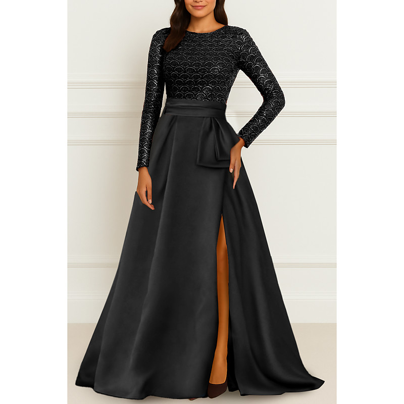 A-Line Floor Length Evening Gown Ball Gown Formal Dress Elegant High Split Long Sleeve Jewel Neck Formal Satin with Glitter Slit