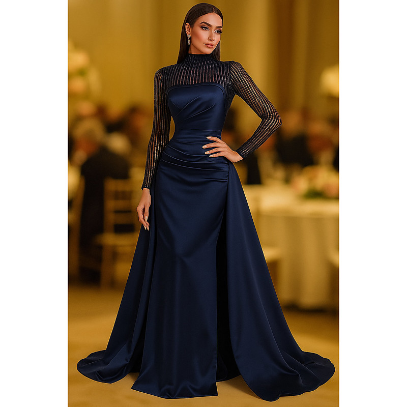 A-Line Floor Length Evening Gown Ball Gown with Overskirt Elegant Glittering Long Sleeve High Neck Wedding Formal Pocket Satin Sequined with Glitter Pleats